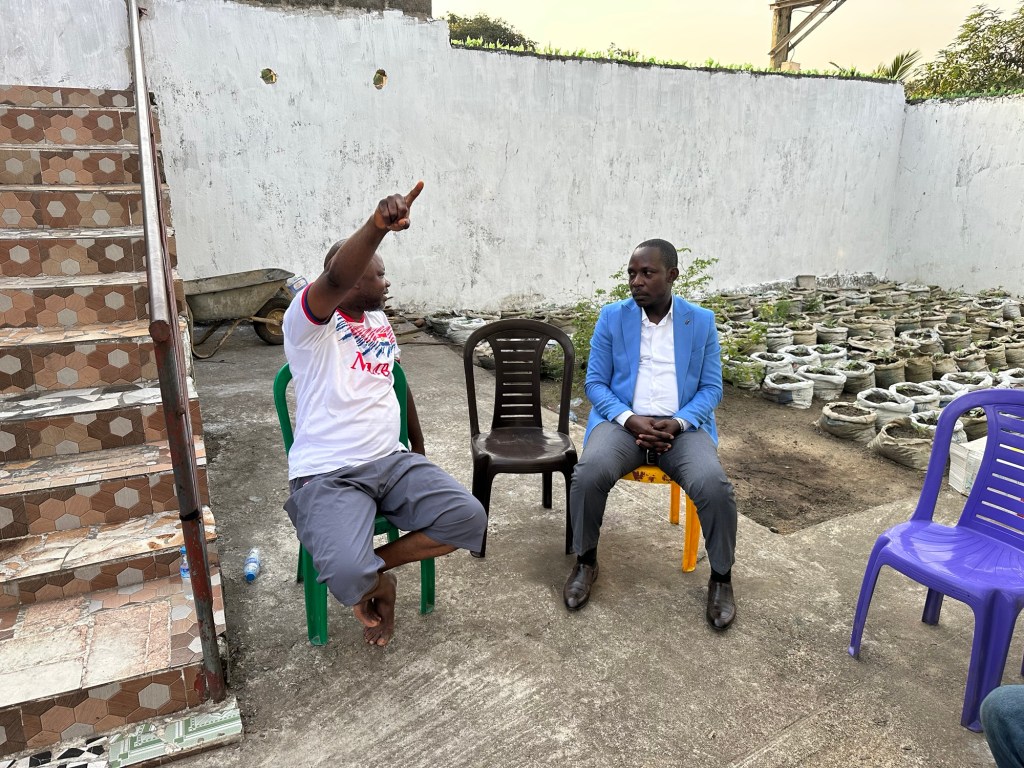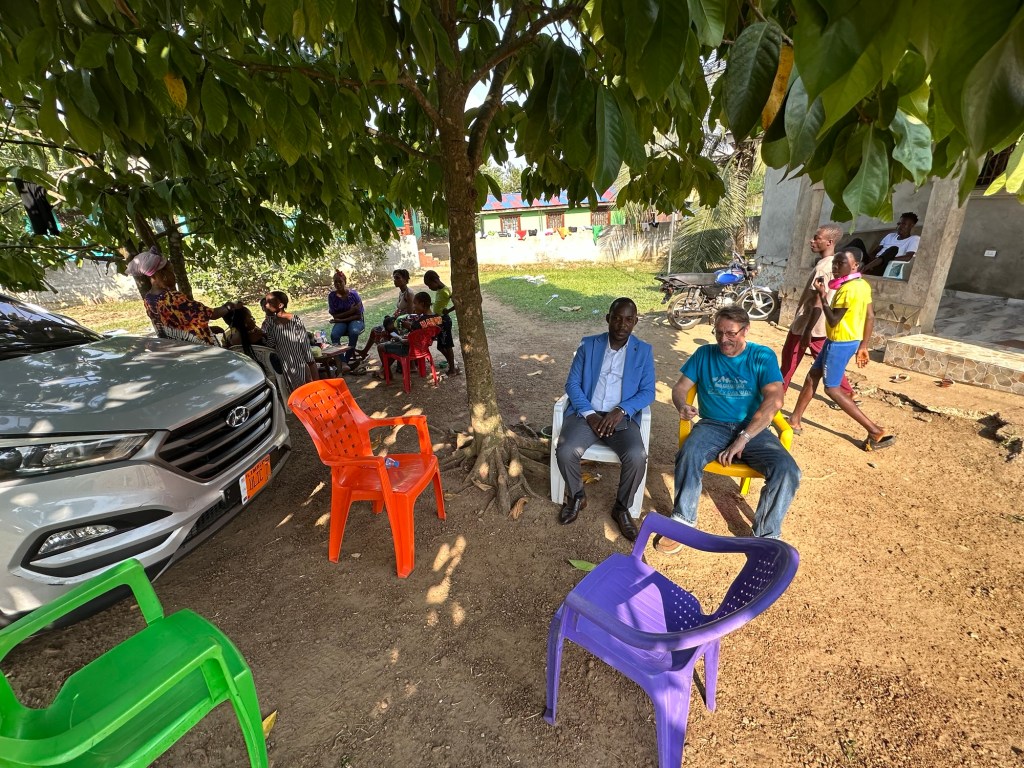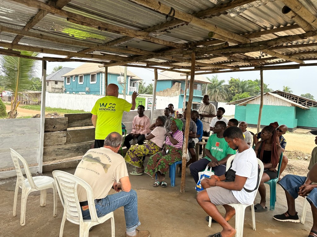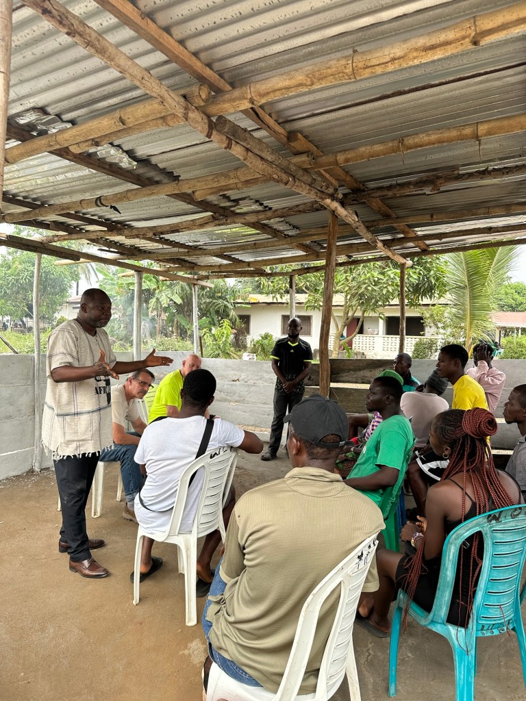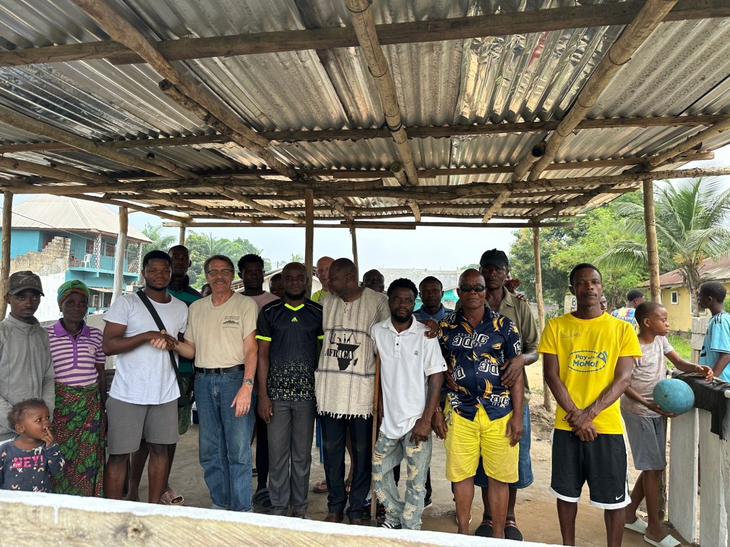 Just before 4:00, we headed across the road and there were chairs being brought over and surprisingly there were many people coming to sit and listen. The moderator started by welcoming all and then Leo began sharing the Gospel and his thoughts about what he believes. The idea of the day was to have a few comments and then questions so a discussion would flow. It was very interesting. We had one gentleman that considered going to a mosque, but he knew the Bible well enough that he couldn’t get himself to go. We encouraged him to just Emmanuel’s church. Emmanuel came over about halfway through and aided in the discussion. Liberians love to have deep discussions and this one was so interesting to see the interest in our thoughts on the Bible and why we think the Bible is the true way. This invite came because Leo took the time to get to know some of them and anytime they’d see Leo eating on the porch or walking by, you’d hear them call out to him. His used Leo’s friendly manner to lead to a deep discussion on the Bible with the clear testimony of salvation proclaimed. After we finished, thru said they hope to continue these discussions in the future and that anytime we are around they hope we will join them. They want to have a safe place to play checkers, discuss politics and religion and hopefully learn things. They want to keep out all drinking and anything that will detract from clear headed discussion. Emmanuel presented Bibles to them with some muffins and water yo share. They were all invited to join LCMI church with the promise that Emmanuel would pursue further interactions with the group. Here’s a few pictures of the meeting.