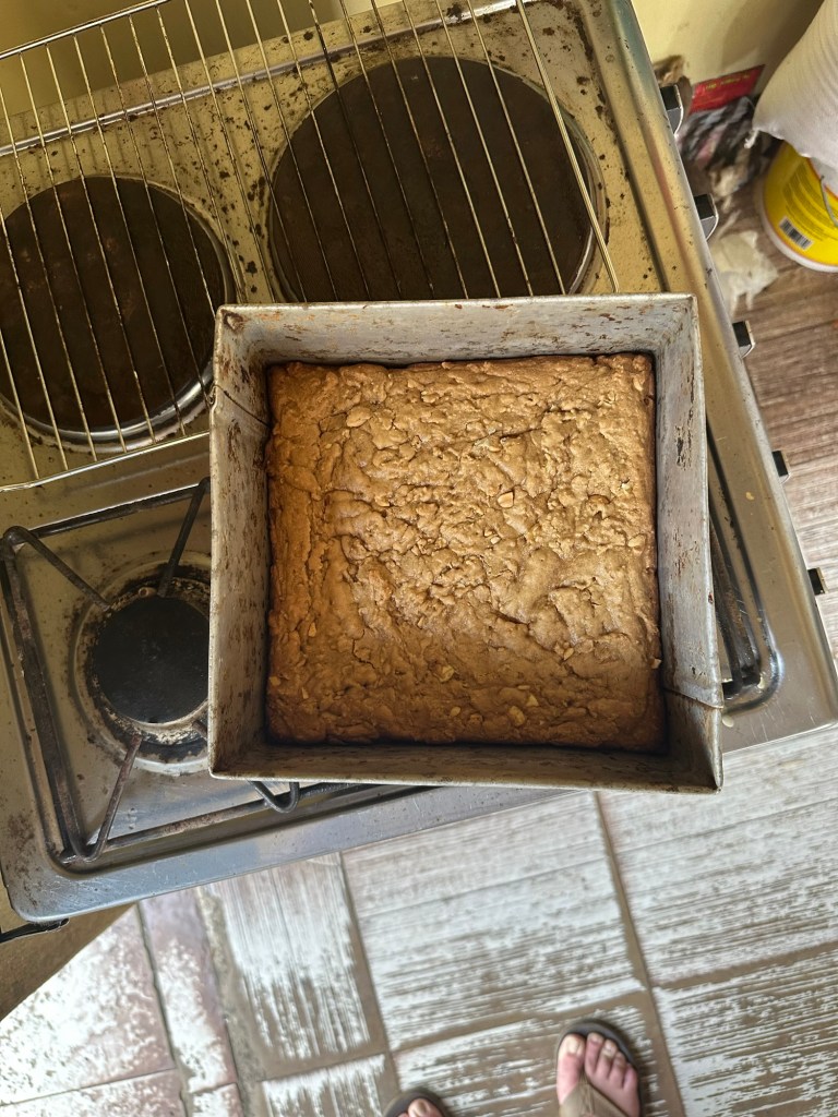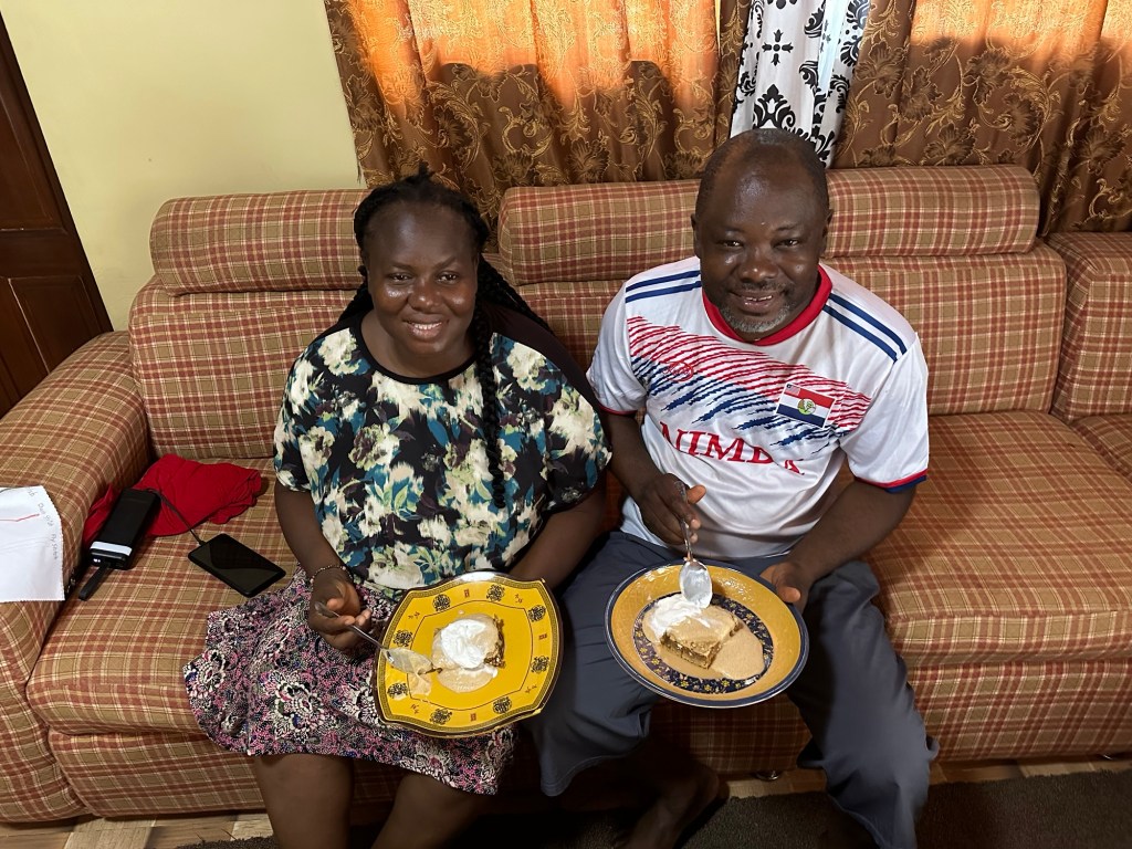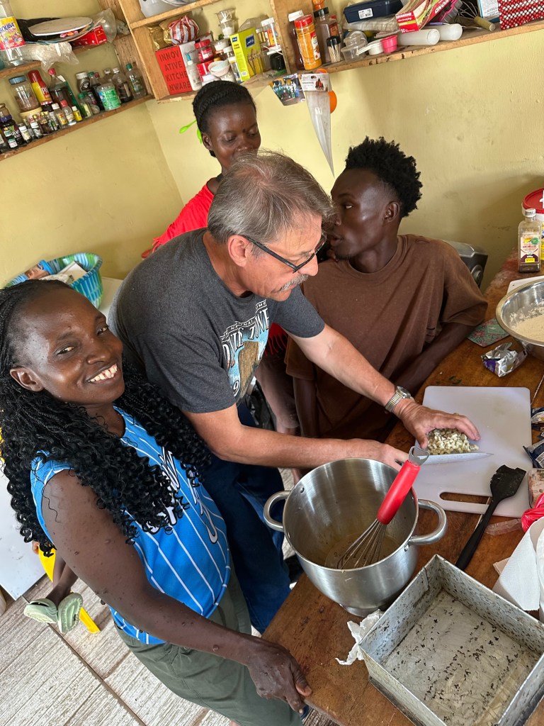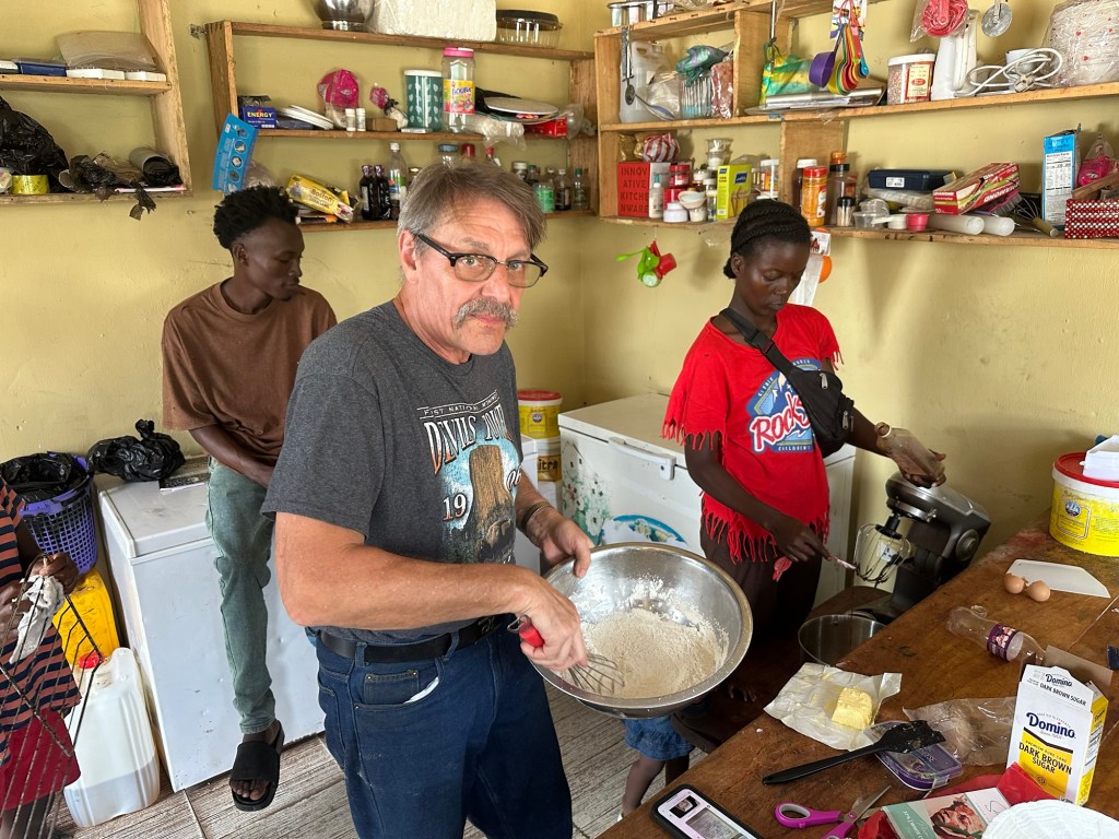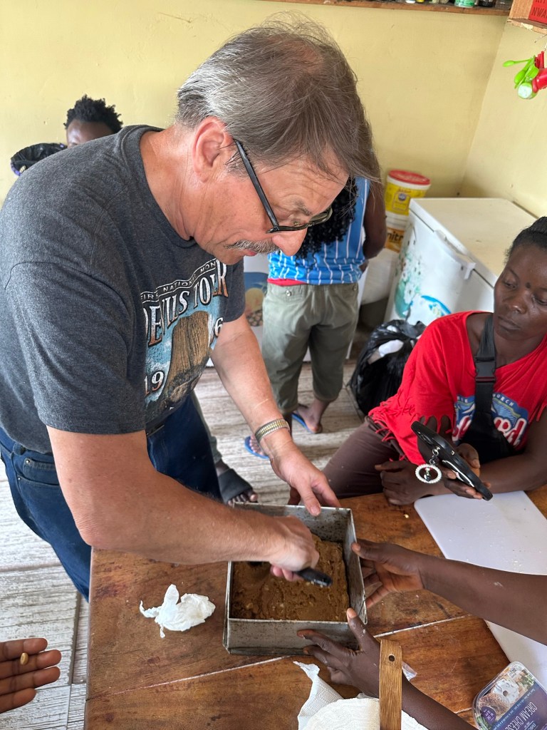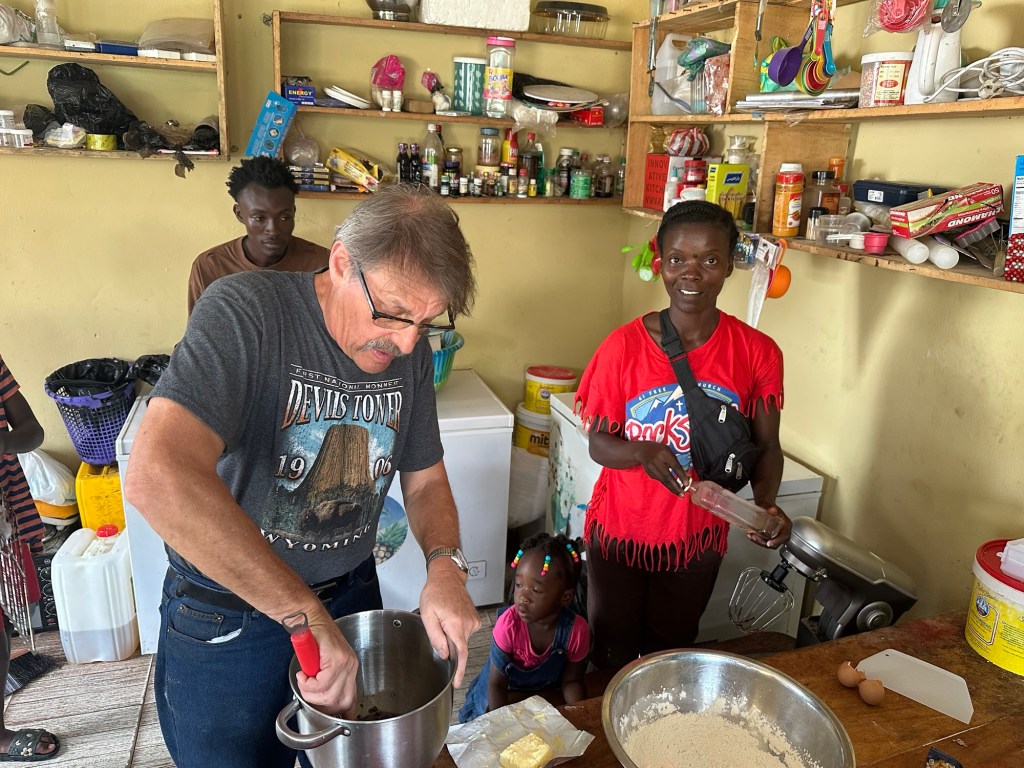 We walked for awhile further, saw the end of a local football (soccer) game that ended in a 2-2 draw and walked back to Emmanuel’s home. By now the heat of the day was upon us. That didn’t mean nothing would be done. The questions were being asked, when would Leo make the blondie that Emmanuel spoke so highly about. It was decided that after a lunch of palm butter with chicken, kissmeat (spiny snails) and fried beef skin, that Leo would show how this was made. By the way, I couldn’t talk Leo or Renee into trying the kissmeat. I tried one, just to say I did. Renee gave some of the beef skin a try.