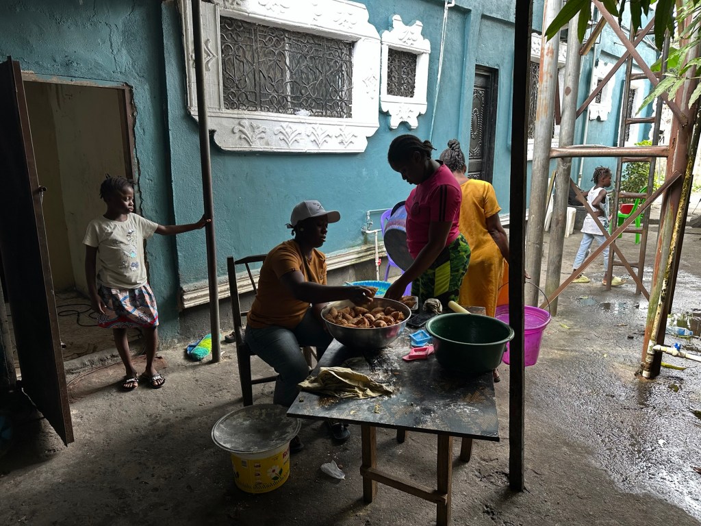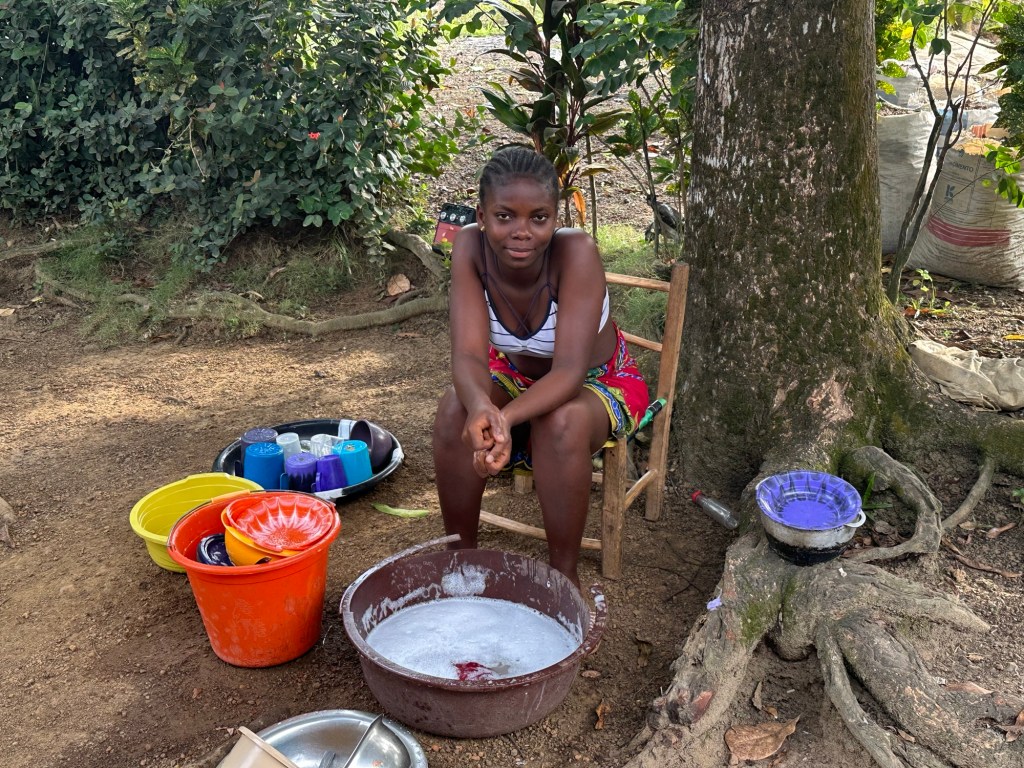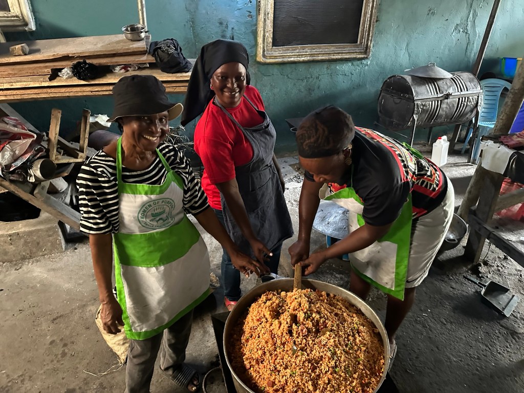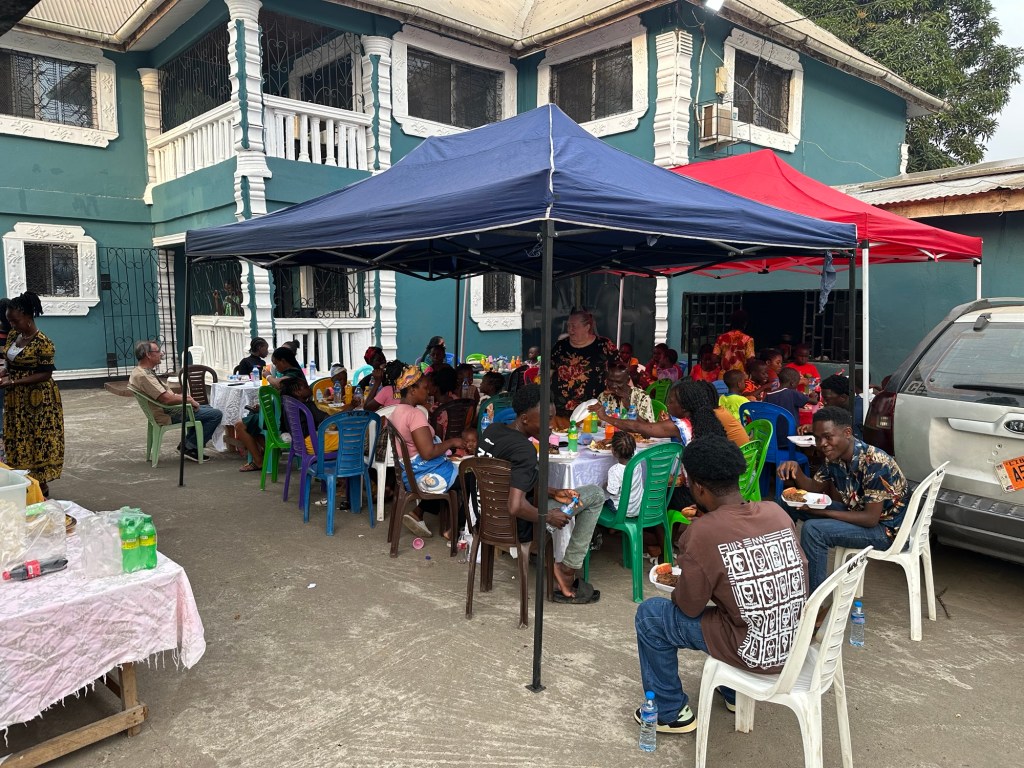 We finished our walk, I had time for a shower and afterwards we headed out at 10:00. We didn’t need too much, but the trip to the store regarding Internet was way downtown. The trip took us 3 hours, but we’ve come to expect things like that. We picked up everything we needed and got home in time to eat lunch after 1:00 PM, knowing the party would start around 4:00. We know this is Liberia, so we didn’t expect to eat right at 4:00. Leo and Renee took a little rest and I sat down in the yard to visit. I was able to go and see the WOP ladies working on our meal for the party.
