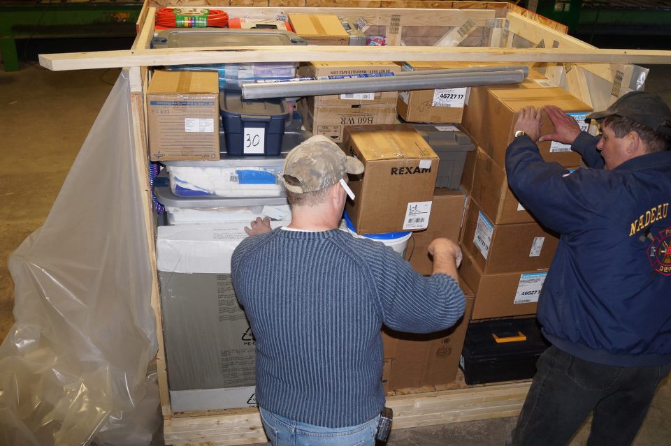 On Monday night, after finding out that we had ‘extra’ room at the top of our packed crate, the owner of Wendricks, Kelly Plunger, decided he would go through the excess clothes at his house with his family. From a text at 10:00 p.m. Monday asking if they might like baseball caps to packing these clothes in large plastic garbage bags and taking them to top off the crate. As Kelly said, ‘It was easy going through all of the family’s drawers to fill these bags when someone on the other end could use them.’ Well, on Tuesday morning Kelly’s small contribution topped off the empty space in the crate with (7) large garbage bags of clothes to fill the gaps. Thanks to you and your family Kelly for sharing your clothes and the materials and labor for the crate. (Pic of crate being filled w/ 2 of the workers that built the crate. Notice the extra room at the top that the bags of clothes were to fill the next day)