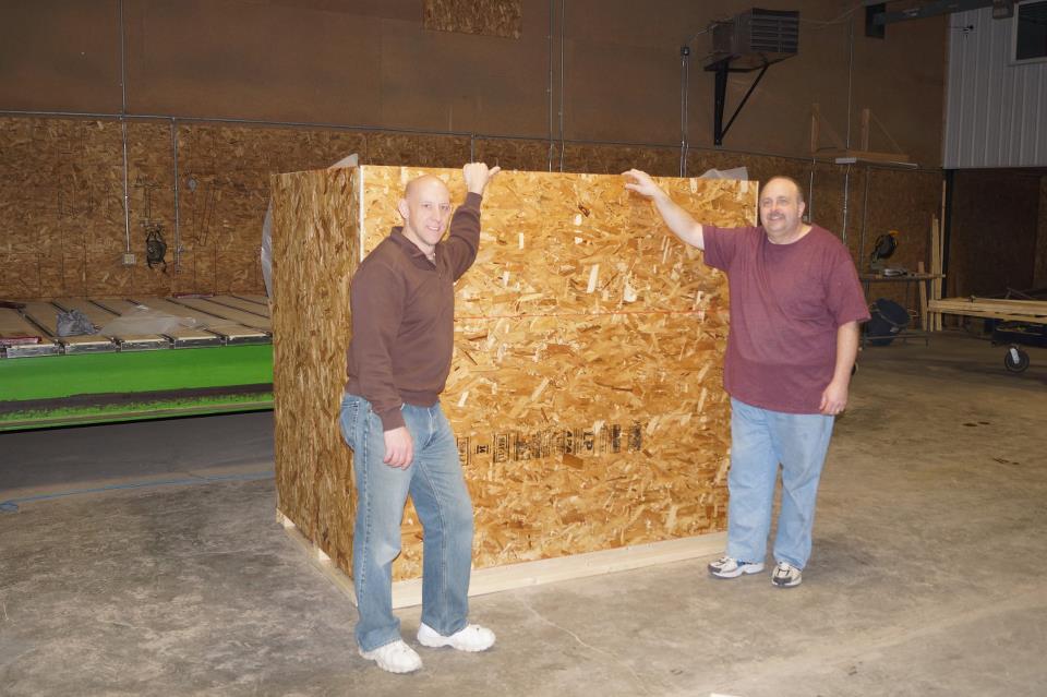 crate for shipping – built by my employer (with use as shelving in new clinic) – donated to our trip. (Pastor Fred and I posing for a picture before the crate is sent out.)