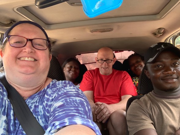 Our day started out good with Jenny feeling better and eating breakfast. It is good to have her back up. We finished eating, sat outside for a little while and then when Abraham came by with the car we piled in to go see Deacon Delt Cooper’s widow, Becky, and her family. Here’s a picture on our way over and you can’t really see Esther sitting in the way back of the car.