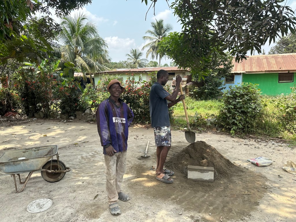 After breakfast it started to get busy quickly, although a little later than the days before. Leo headed to the garden to dig holes. I watched as he used the tools he was given. We do have a new hammer, but he wanted to use what Aloysius (garden guy) gave him.