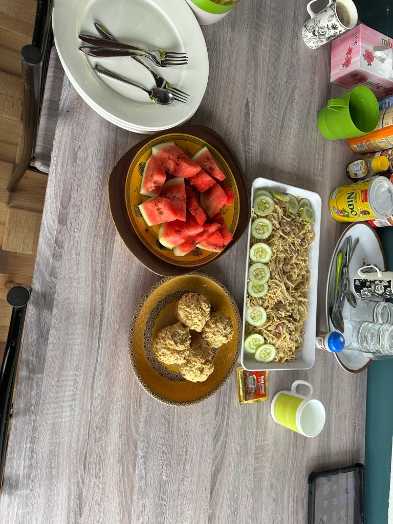 We got home and Leo set out to work on the loom frames and I went to study more for my first Biblical Counseling training. I was still feeling a little tired from our travels and the heat and I laid down after studying with a timer set for 45 minutes. The timer I got was a little boy named Thaddeus (mentioned in an earlier trip), who walked in and said, ‘Dad Robin, Mother says the food is ready for you now.’ Although he surprised me, I couldn’t help but smile at him and tell him I’ll be right out. It was around 1:30 and I wasn’t thinking about eating. Well, we all took the time to eat and it was some form of Lentil soup over rice with fruit and cucumbers. All in all it was very good.