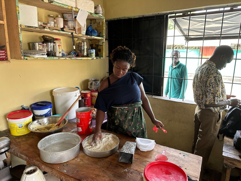 Every day before it begins, we wonder if it’s gonna be busy or not. We should know not to expect a light day. Renee planned on getting up early to cut out the patterns for WOP She woke up early but wasn’t able to get into cutting the patterns because LEC (Liberia electric company) was off and the solar had run out and they did not start the generator up right away in the morning. All three of us woke up early and Philip came into my room to flip a switch to allow the generator to run so we could have current as they call it here once Philip came in to flip the switch. I decided I might as well get up and I came into the sitting room and Leo and Renee had the same idea. It was before seven and it starts getting light around seven. The power went out around 3:30 in the morning. Since it was beginning to get light, Renee started cutting on the patterns for the work with WOP. We noticed that each day gets a little bit later for everyone to get going as the week progresses.