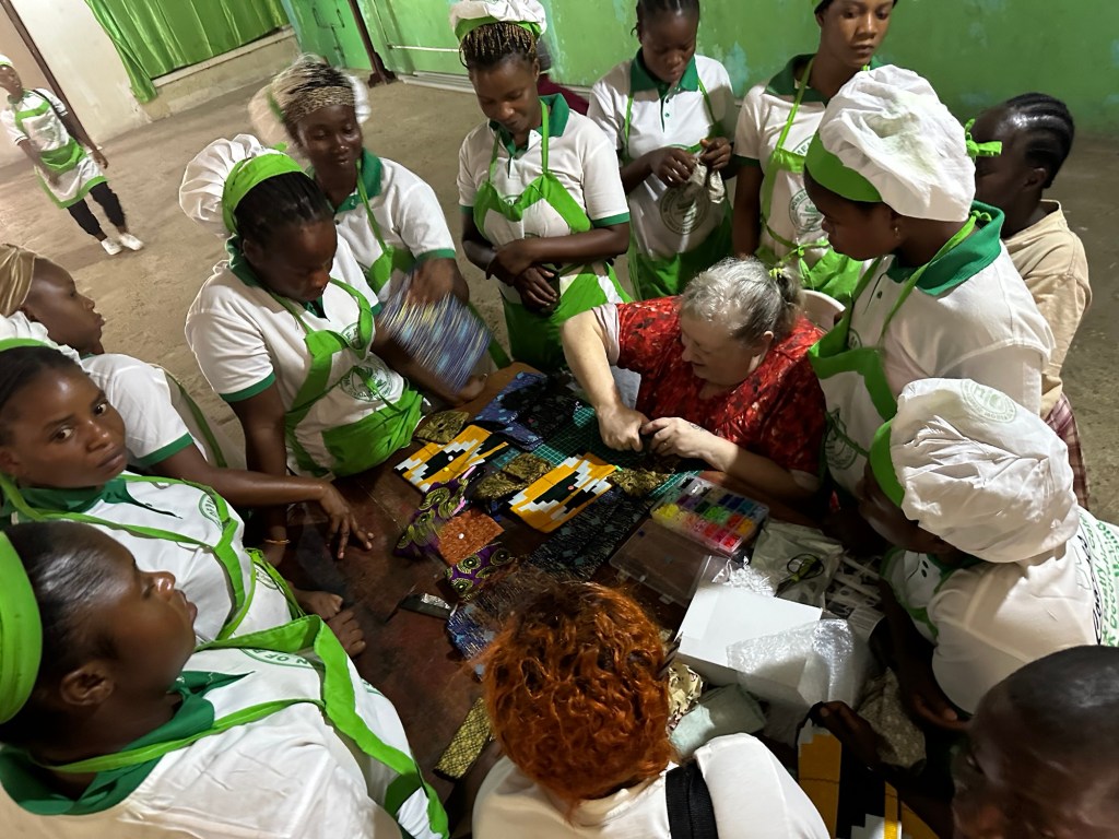 We got Renee over to begin a day’s training and there were over 30 women and not enough material for the project planned. Emmanuel, Leo, Dennis (Emmanuel’s uncle who showed up in Ganta) and myself headed out to buy another 5 yards of black material for the backing of the project. We found some at the market and Emmanuel figured we should go and pick up the food we ordered. The only thing was they intended to serve it on their good plates. So, we sat down to eat with Dennis accepting just a coke. They forgot to prepare one of the meals, so we clarified what we needed packed up for takeout while we ate what they served. It was good food with leftovers for Dennis, but we were feeling we should get back to Renee with the fabric. We arrived just in time as she had need of it. She didn’t have time to eat what we carried, but kept on teaching the ladies. Leo helped Renee by holding the flashlight and answering what questions he could answer. I found a group of kids and had a good question and answer session with them about America. After another 1-1/2 hours we were informed the ladies at this WOP had some lunch ready for us. By now Renee was quite hungry so she took a break and all of had more to eat. I told Renee our next stop was to take a trip to Saclapea to meet another WOP chapter. We were to leave at 4:00 PM to drive the hour there to greet this chapter. Since she was already at a stopping point, she said she’d wrap it up in Ganta and we got on the road by 3:30. After the visit in Saclapea, they also served us some food…and NOW we are on the road back to Ganta. I’m not sure I’ll have coverage to upload photos, but I’ll try a few. If not, this will be the update.